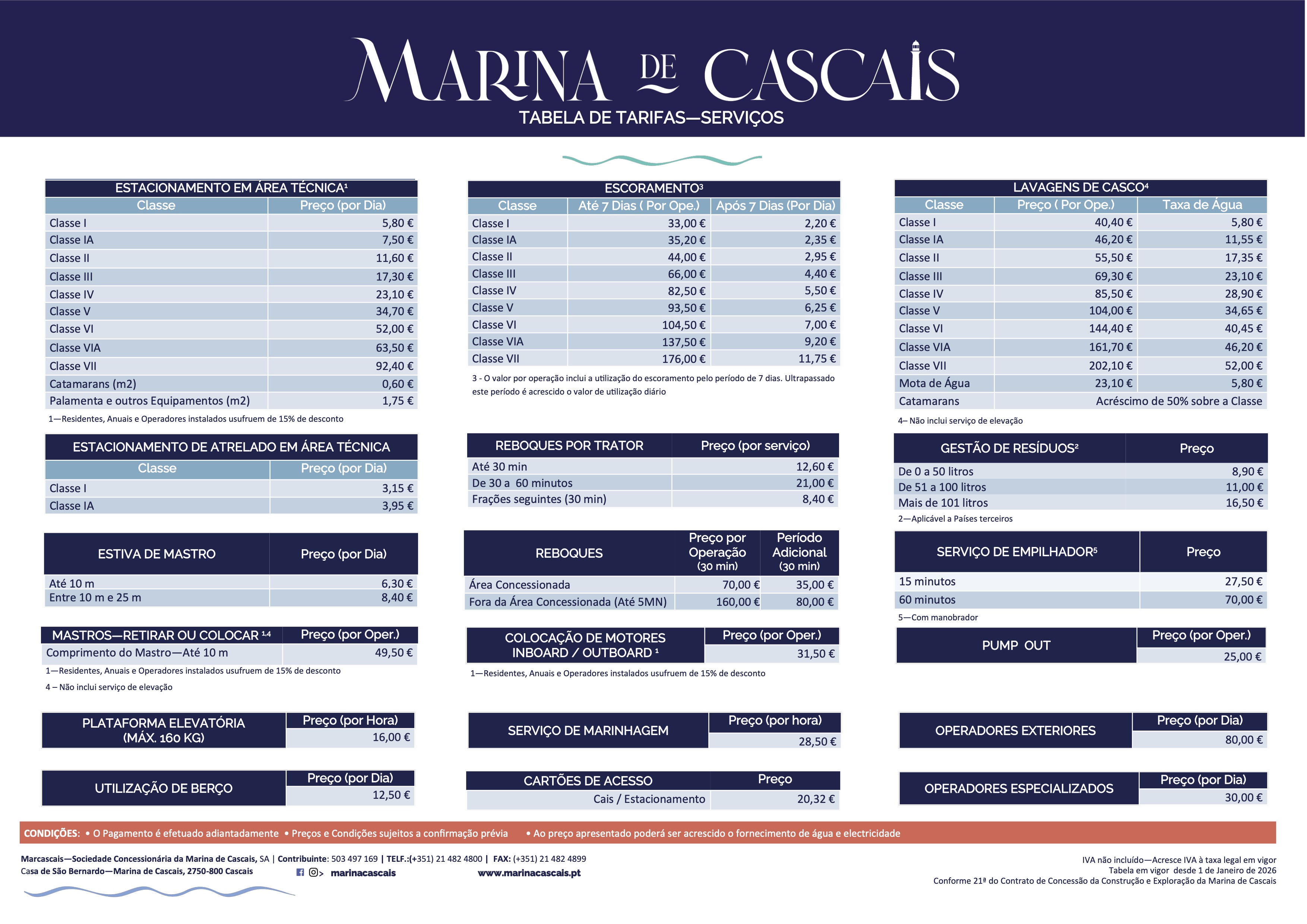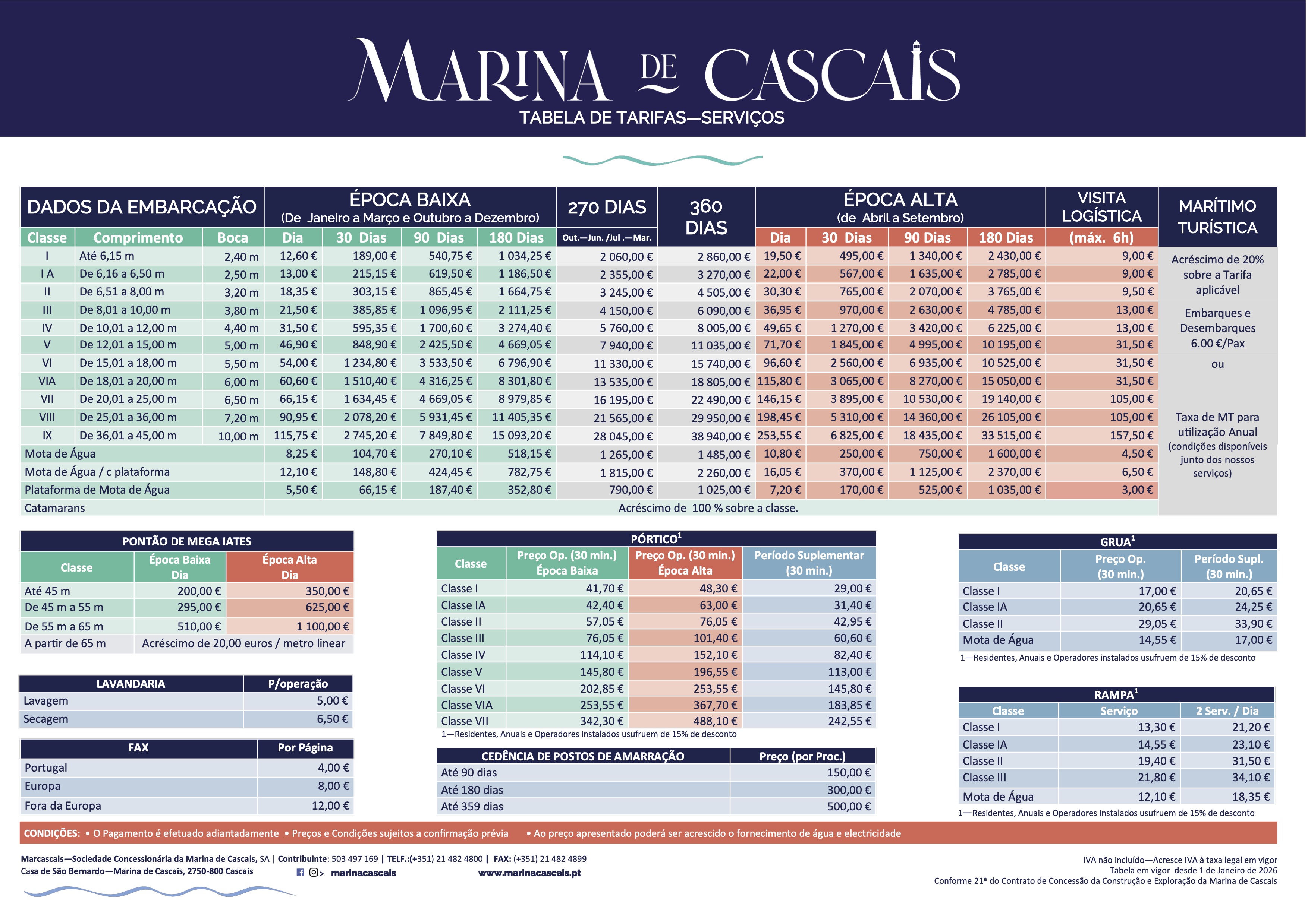 Estadias e serviços – o tarifário na Marina de Cascais é estabelecido pelo comprimento da embarcação e tamanho de boca.